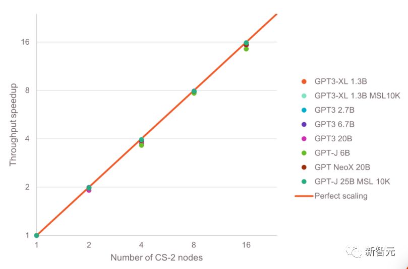 与任何已知的基于GPU的集群不同,Andromeda在GPT级大型语言模型中展现了「近乎完美」的可伸缩性。在GPT-3、GPT-J和GPT-NeoX中,Andromeda的处理能力随CS-2数量的增加呈现了近乎完美的线性增长。