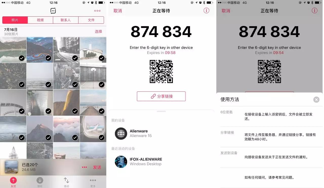 「通过 6 位密钥传输的文件会直接在两个设备之间进行传输,并不在服务器上存储文件,所以你不必担心文件泄漏。」