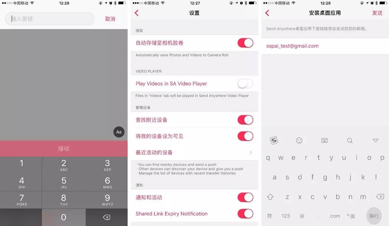SendAnywhere 的接收界面、设置界面、发送桌面应用到邮箱
