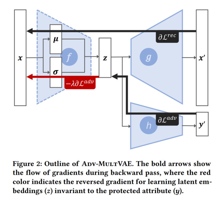 协同过滤算法除了捕捉用户潜在的消费模式外,还会学习用户特定的人口统计学特征或受保护信息等特征,如性别、种族和地理位置位置。这些偏见(Bias)信息会进一步影响推荐系统(RS)的决策,使得推荐算法会提供给不同用户子群的内容进一步分离,这将引起对用户受保护属性泄露的隐私问题。通过观察下图,可以发现基本的推荐算法(MultVAE)存在性别上的偏差,使得攻击者可以很容易的识别这种模式并进行敏感属性的推测。