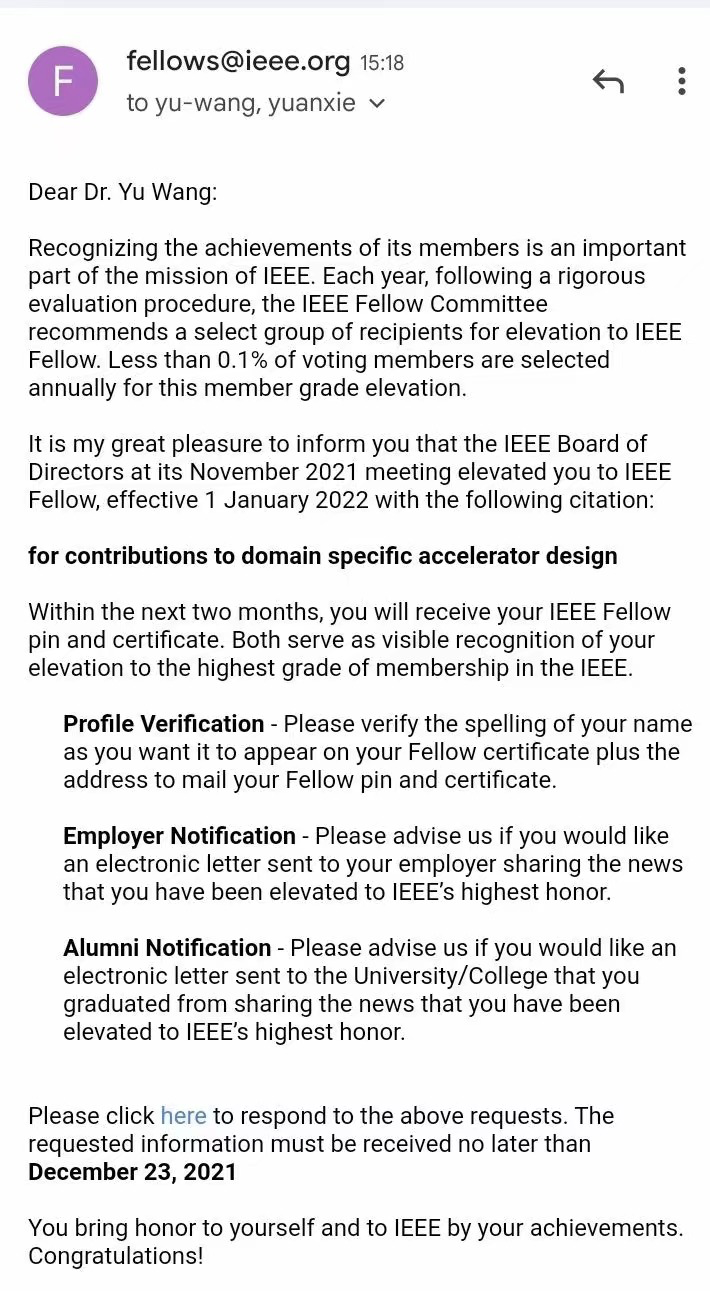 39岁清华大学电子工程系主任汪玉当选2022 IEEE Fellow,以表彰他对领域专用加速器设计做出了贡献。