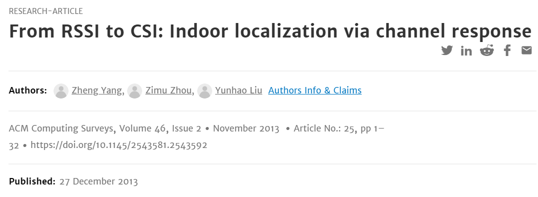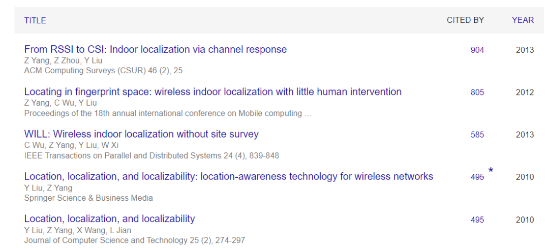 其中,他被引用数最高的一篇论文是2013年发表在 ACM Computing Surveys 上的《From RSSI to CSI: Indoor localization via channel response》,目前已被引用904次。