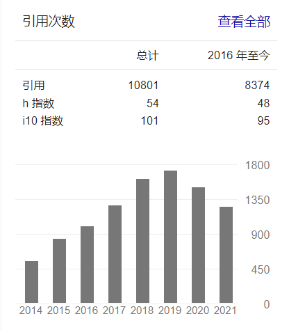 据Google Scholar显示,杨铮副教授论文被引用总次数已经超过1万次,其中2016年至今被引用8000余次,2018、2019年连续两年论文被引用超过1500次。目前H指数为54。