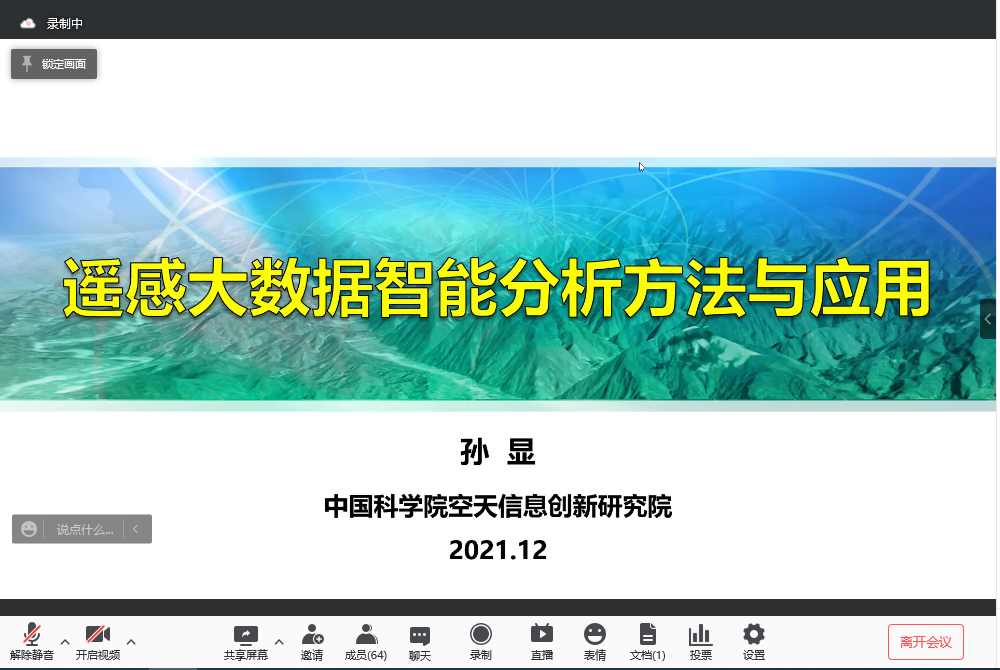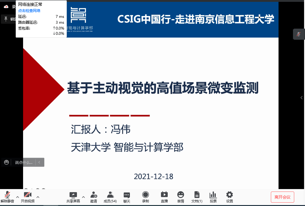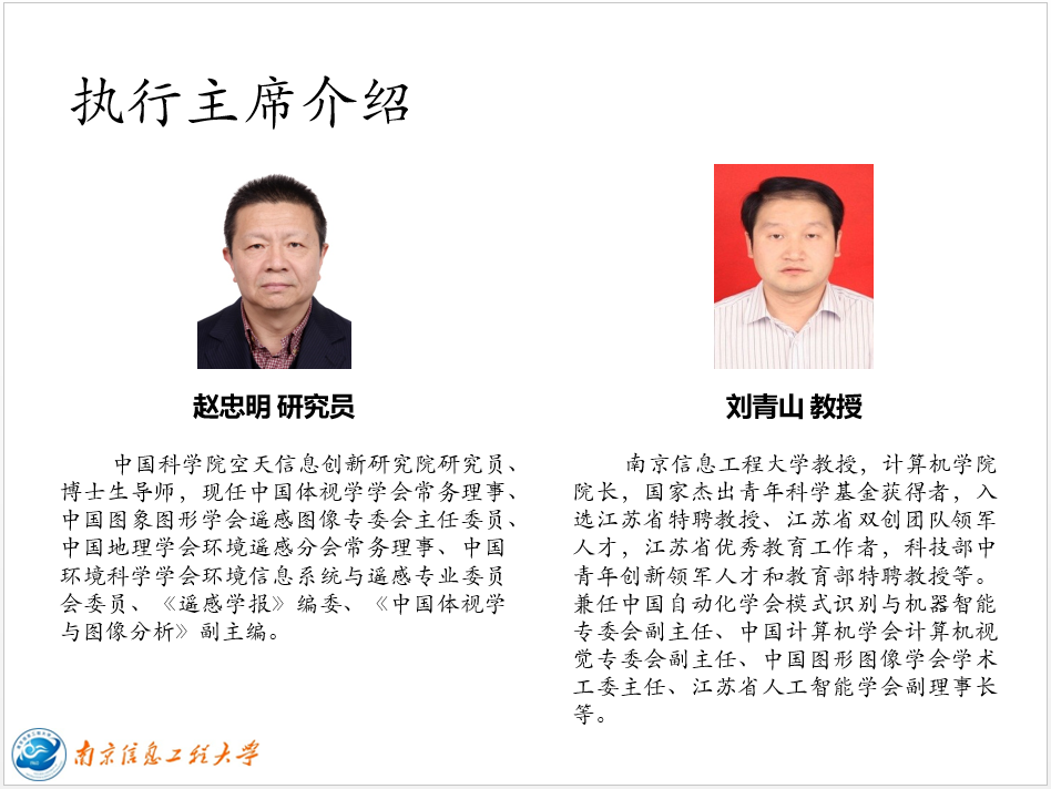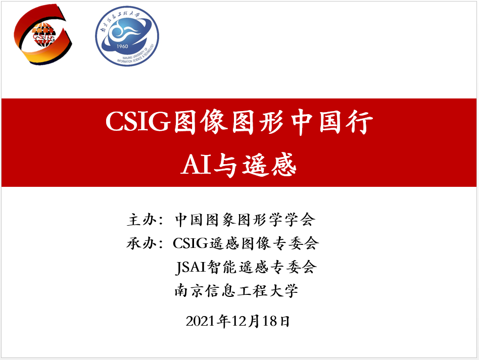 2021年12月18日,“CSIG图像图形中国行”走进南京高校,本次活动由中国图象图形学学会主办,中国图象图形学学会遥感图像专业委员会、江苏省人工智能协会智能遥感专委会和南京信息工程大学共同承办,活动形式为线上会议,会议主题为“AI与遥感”。南京信息工程大学计算机学院院长刘青山教授主持会议,中国图象图形学学会遥感图像专委会主任委员赵忠明研究员致辞。北京理工大学陶然教授和李伟教授、天津大学冯伟教授以及中国科学院空天信息创新研究院孙显研究员受邀作报告,本次会议得到了广泛关注,吸引了来自各个高校师生80余位参加会议。
