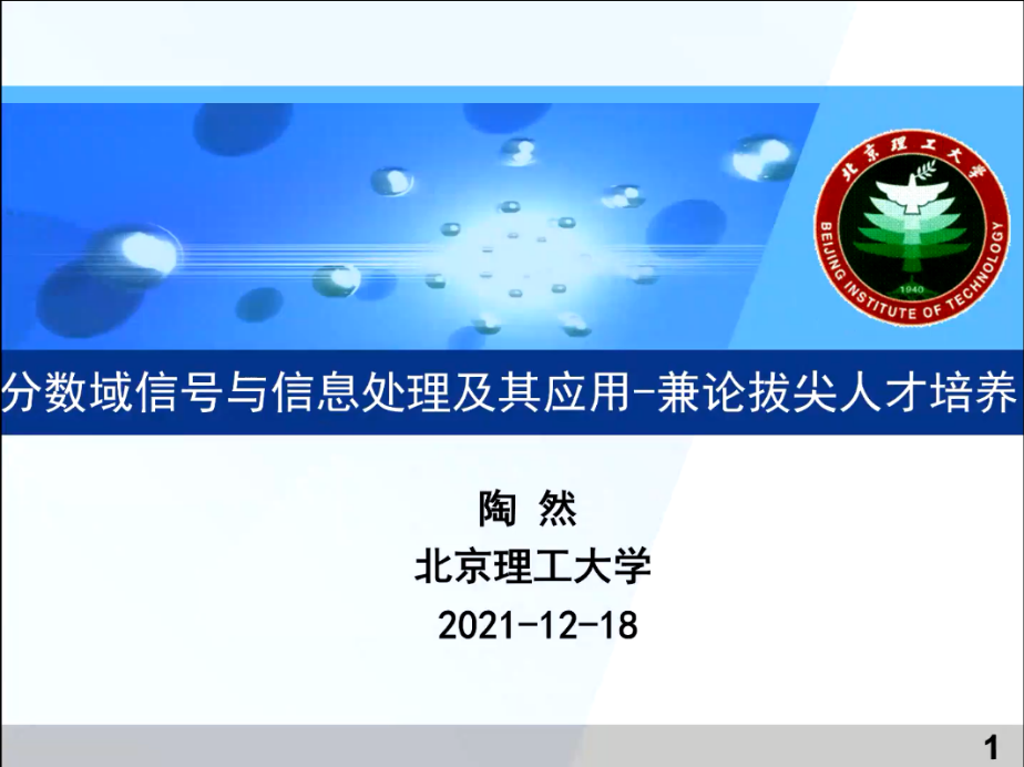 来自北京理工大学的陶然教授在此次会议上作了题目为“分数域信号与信息处理及其应用–兼论拔尖人才培养”的报告。报告围绕分数域信号处理及其应用,概述了分数域信号处理的国内外研究团队及其最新研究进展;介绍了以分数域采样、分数域滤波和多分数域联合分析等理论方法形成的分数域信号处理体系及其在雷达、通信、导航和光学测量等方面的应用;指出了分数域信号处理在解决高速、高加速目标探测与识别、城市和海洋环境中的低慢小目标探测与识别等当前国家重大需求问题上起到的关键作用;讨论了分数域信号处理未来的发展方向和应用潜力;最后探讨了拔尖人才培养的教学理念。