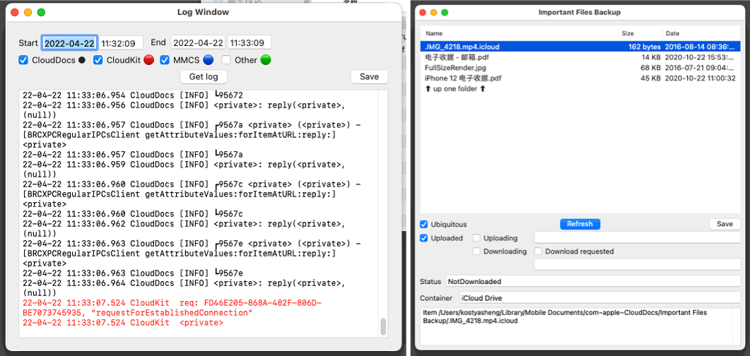 这个命令能够将 iCloud 同步过程中各种信息直接显示到屏幕上,方便我们进行诊断,虽然吐出来的日志记录非常「事无巨细」,但我们只需要关注有无类似下图的错误信息或者有不断滚动的检索队列,就能确认我的 iCloud 云盘同步已经卡住了。