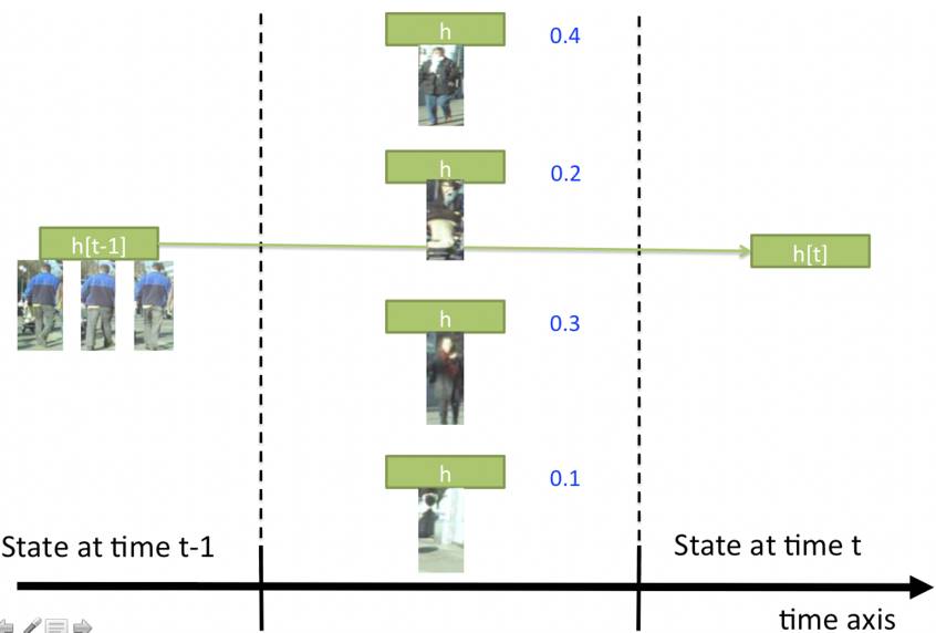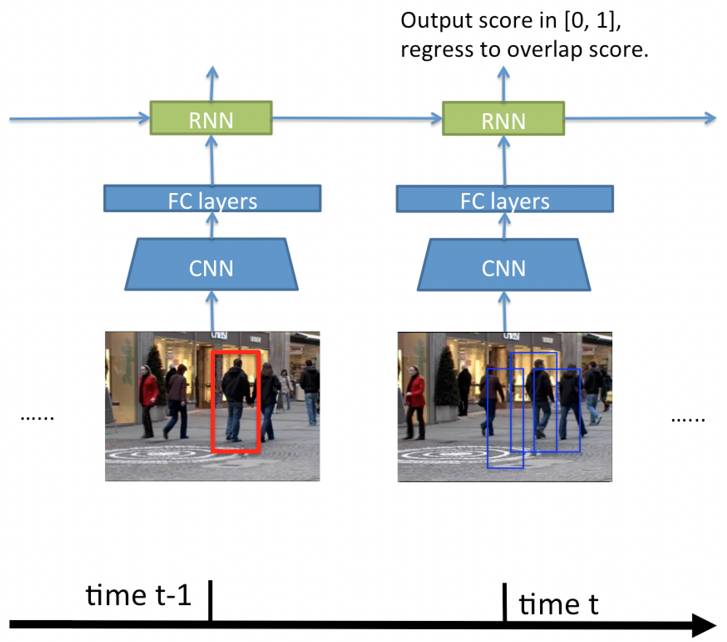在顶层,我们设计了RNN,用来利用之前时间序列中的空间信息以及从当前时间点提取出来的图像特征。每一个时间t,RNN计算出每个候选区域的IOU(重叠率)以及当前隐层的状态。每个候选区域将会生成单独的新的隐层状态,我们选择最高得分的IOU来更新隐层。
