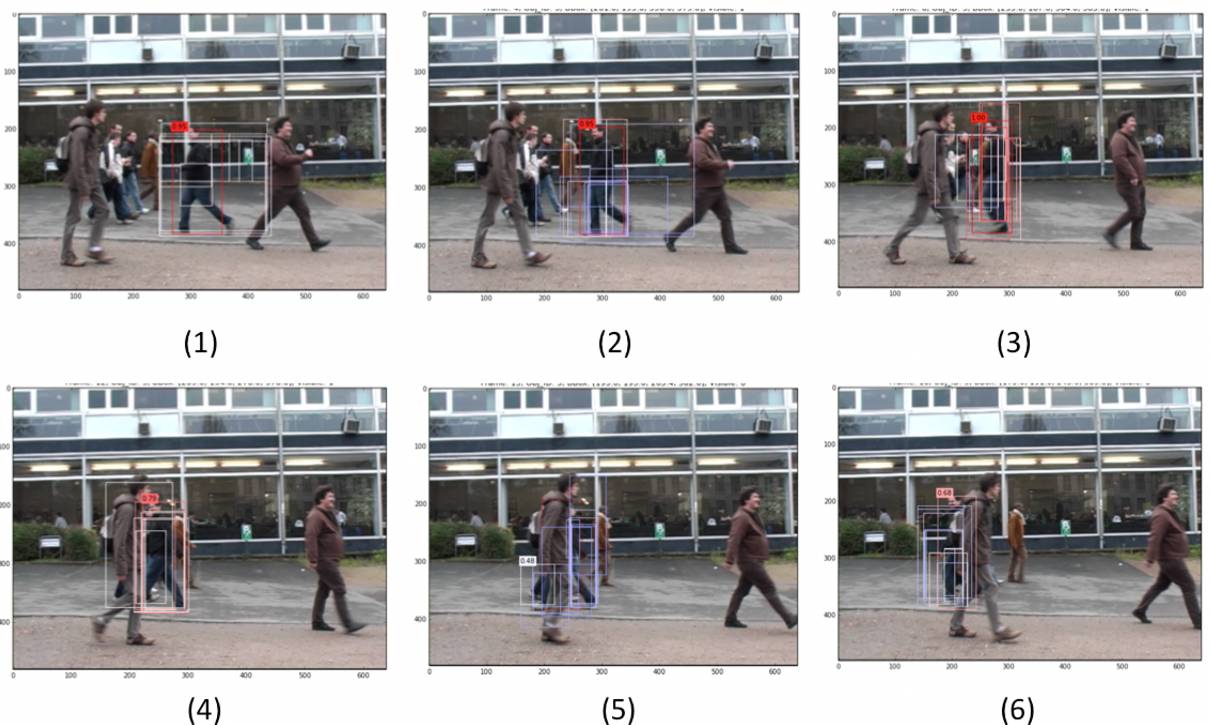 我们的目标跟踪结果如下图所示,颜色代表跟踪得分,红色代表高分值,蓝色代表低分值,白色代表中等分值。从下图我们可以看看出,当被跟踪目标没有被遮挡时,我们的跟踪系统成功地跟踪到了目标,并给出了高分值。当目标消失后,没有一个区域被给予高分值。当目标重新出现后,跟踪系统重新识别了目标,并给予高分值。