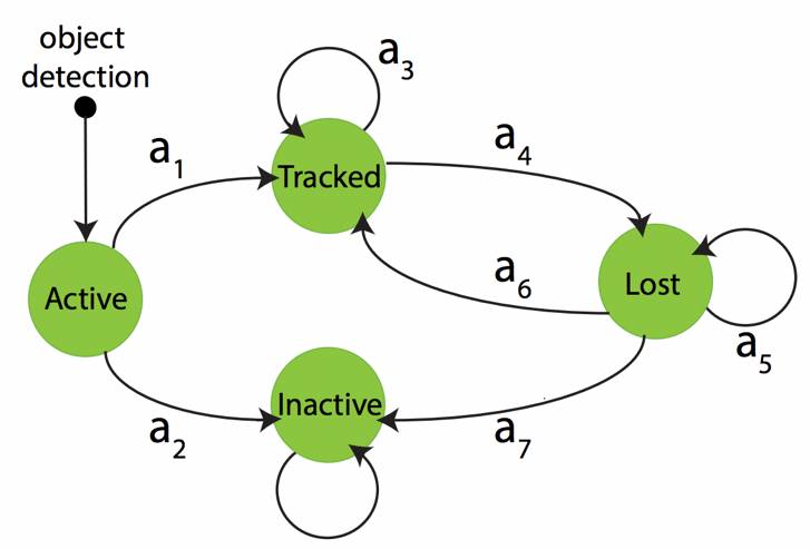 我们将目标跟踪定义为一个马尔可夫决策问题。视频中的目标会经历四个状态,初始化,被跟踪,丢失,重新跟踪。这篇文章主要集中在单目标跟踪问题。