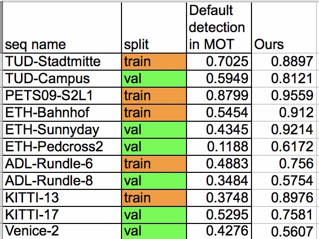 在Fast-RCNNCaffe版本的基础上我们实现了Fast RCNN模型的TensorFLow版本。我们使用MOT测试数据的一半作为训练数据,另一本作为测试数据。如表所示,我们的检测系统的性能比默认的检测系统性能高出12到52个百分点。