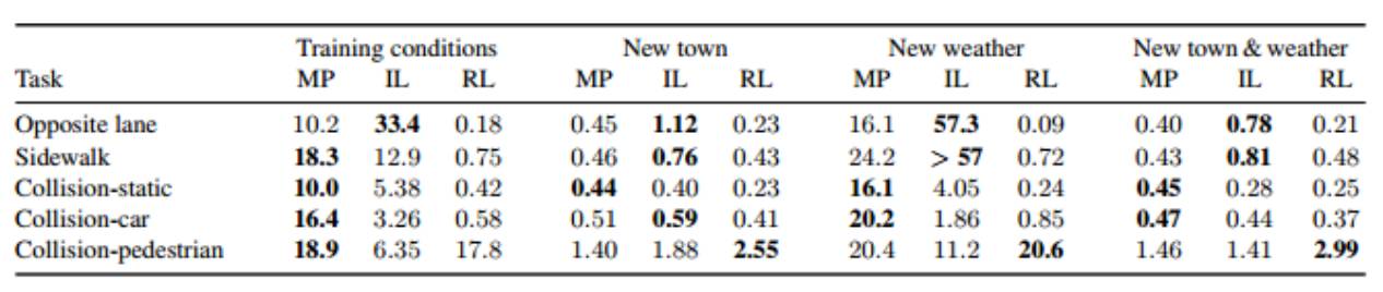 表 1:三种自动驾驶系统在目标导向导航任务中的量化测评。这张表记录了在每一种环境下每个不同的方法成功完成某个任务中的片段所占的百分比,越高越好。被测试的三种方法分别是:模块化流水线(MP)、模仿学习(IL)、以及强化学习(RL)。