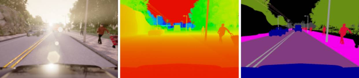 图 2:CARLA 提供的三种不同模式的传感。从左到右依次是:正常的摄像头视觉、真实深度、真实语义分割。深度和语义分割是由支持控制感知作用实验的伪传感器提供的。额外的传感器模型可以通过 API 接入。