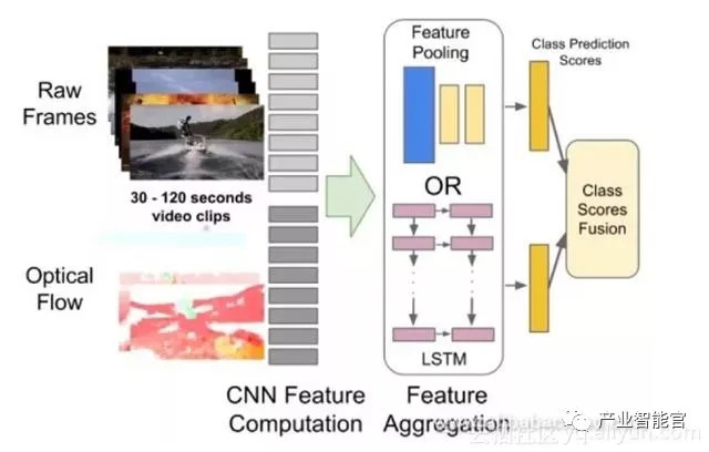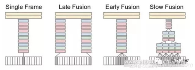 这类方法将视频视为一系列帧图像,网络接收属于视频的一组多帧图像(例如15帧),然后从这些图像中提取深度特征,并最终集成这些图像特征以获得视频的该部分的特征以对其进行分类。实验表明,使用“慢速融合(slow fusion)”效果最佳。此外,独立组织单个帧也可以得到非常有竞争力的结果,这意味着来自单个帧的图像包含大量相关信息。