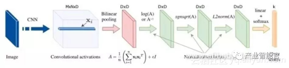 首先计算卷积描述符的外积,以找出不同维度之间的相互关系。因为不同描述符的维度对应于卷积特征的不同通道,并且不同的通道提取不同的语义特征,所以使用双线性操作允许我们捕获输入图像上的不同语义元素之间的关系。