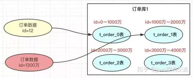 range方案比较简单,就是把一定范围内的订单,存放到一个表中;如上图id=12放到0表中,id=1300万的放到1表中。设计这个方案时就是前期把表的范围设计好。通过id进行路由存放。