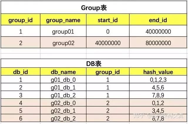 我们先定义一个group组概念,这组里面包含了一些分库以及分表,如下图: