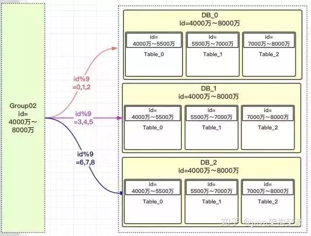 现在小伙伴们有没有理解,这样的设计就可以把多一点的数据放到DB_0中,其他2个DB数据量就可以少一点。DB_0承担了4/10的数据量,DB_1承担了3/10的数据量,DB_2也承担了3/10的数据量。整个Group01承担了【0,4000万】的数据量。