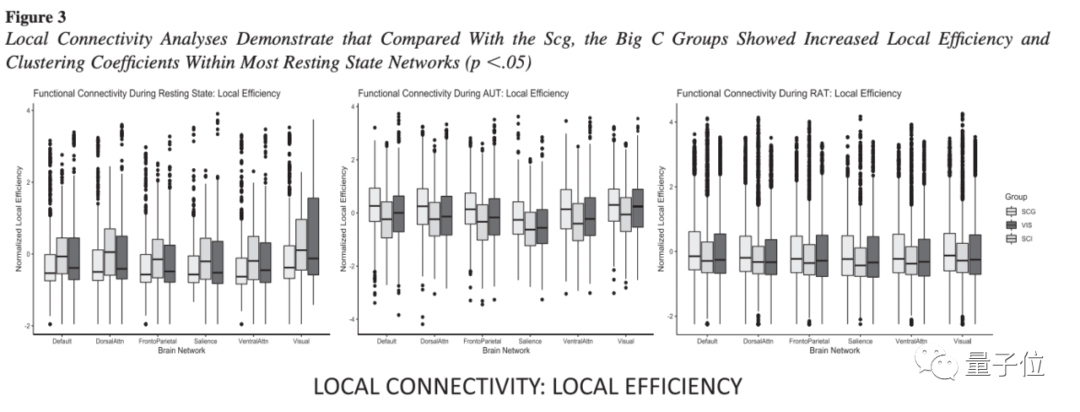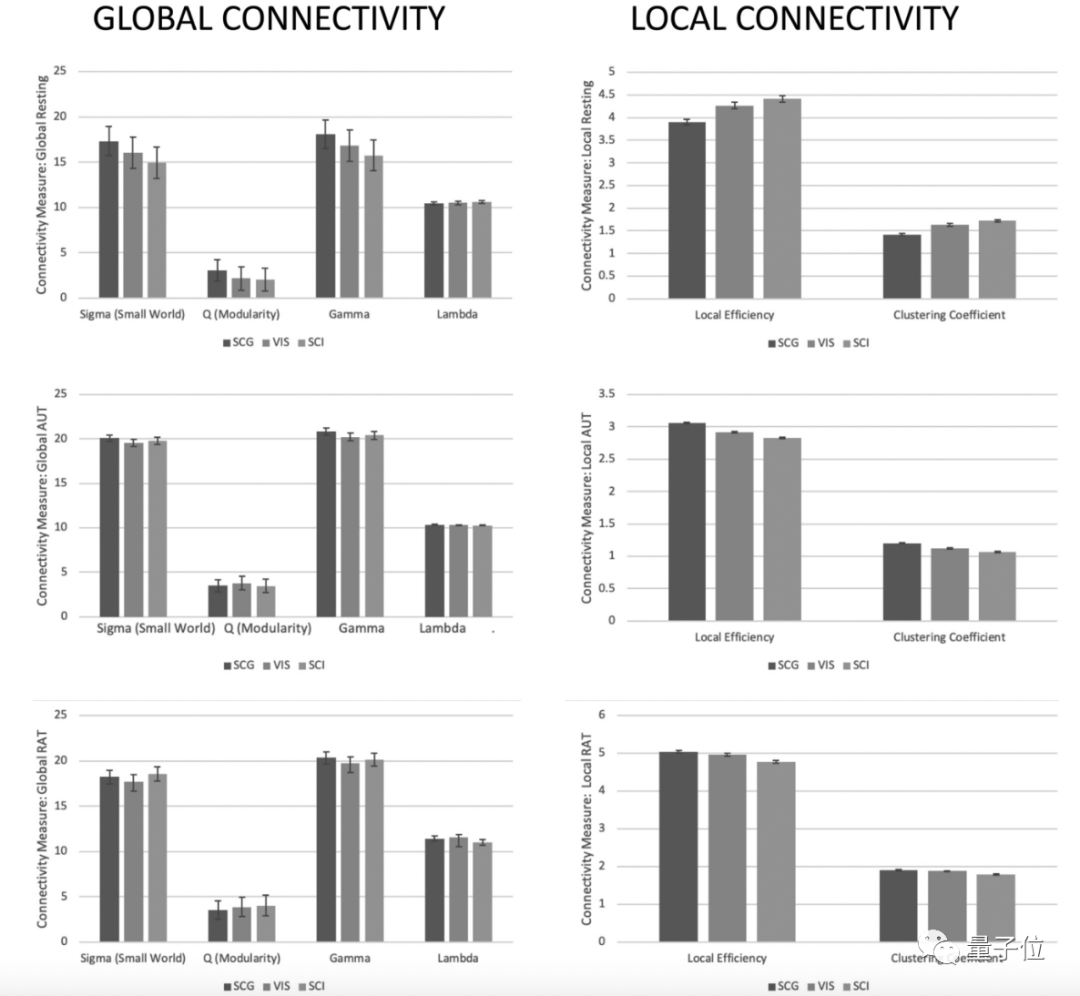 上述功能连接说明,拥有特别创造力的SCI和VIS组,拥有更多的大脑全局随机连接模式,而这种模式下小世界连接更低,在进行动态思考的情况下大脑网络的效率差。