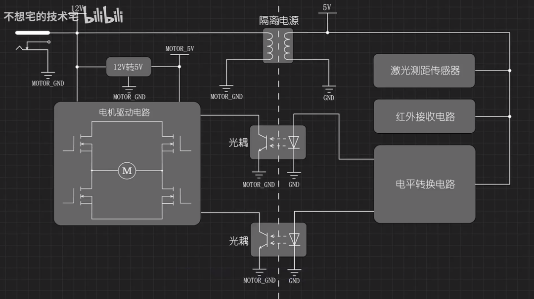 下图是整个电源以及隔离设计的框图,整个电机控制部分和其他电路没有实际的连接,电机在工作时不会干扰其他电路: