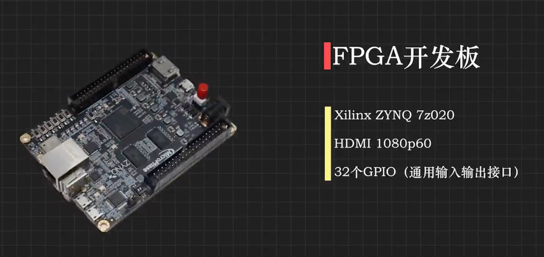 UP 主选用了一款 FPGA 开发板,主芯片为 Xilinx ZYNQ7000,板上搭载了一个最高可输出 1080p60 帧视频的 HDMI 接口、32 个 GPIO(通用输入输出接口)等其他外设。在这块开发板上,将要完成雷达数据的采集、运算和显示。