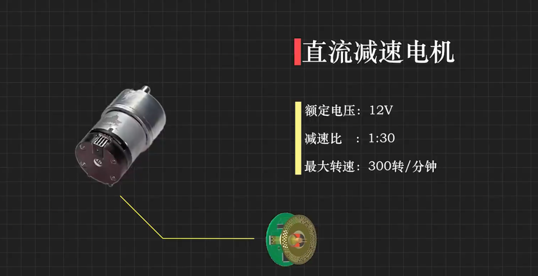 此外还有一个直流减速机,额定电压为 12V,减速比为 1:30,最大输出转速为 300 转每分钟,电机尾部安装了 500 线的光电编码器,通过光电编码器可以获知输出轴的转动角度。
