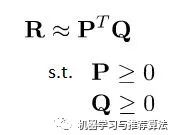 相乘的形式,这些方法的共同之处是,即使原始矩阵的元素都是非负的,也不能保证分解出的小矩阵都为非负,这就导致了推荐系统中经典的矩阵分解方法可以达到很好的预测性能,但不能做出像User-based CF那样符合人们习惯的推荐解释(即跟你品味相似的人也购买了此商品)。在数学意义上,分解出的结果是正是负都没关系,只要保证还原后的矩阵元素非负并且误差尽可能小即可,但负值元素往往在现实世界中是没有任何意义的。比如图像数据中不可能存在是负数的像素值,因为取值在0~255之间;在统计文档的词频时,负值也是无法进行解释的。因此提出带有非负约束的矩阵分解是对于传统的矩阵分解无法进行科学解释做出的一个尝试。它的公式如下: