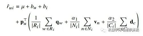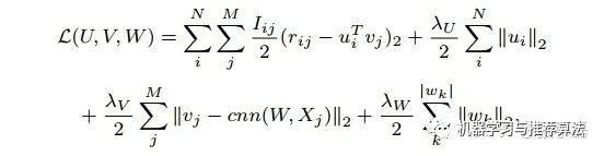 矩阵分解作为协同过滤模型中经典的方法,性能当然没的说。但它存在的数据稀疏与冷启动问题一直以来都是它的痛点,因此结合外部丰富的信息成为了缓解上述问题的有效途径。其中文本数据作为web中主流的数据形式成为了首选,并且对于文本的处理,大部分还是基于one-hot的表示,因此无法捕捉文档中上下文的关键信息,于是作者将两者做了结合,具体细节请参见论文,该公式如下: