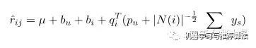 在用户除了显式评分外,隐式反馈信息同样有助于用户的偏好建模,因此随后提出了SVD++。它是基于这样的假设:用户除了对于项目的显式历史评分记录外,浏览记录或者收藏列表等隐反馈信息同样可以从侧面一定程度上反映用户的偏好,比如用户对某个项目进行了收藏,可以从侧面反映他对于这个项目感兴趣,具体反映到预测公式为: