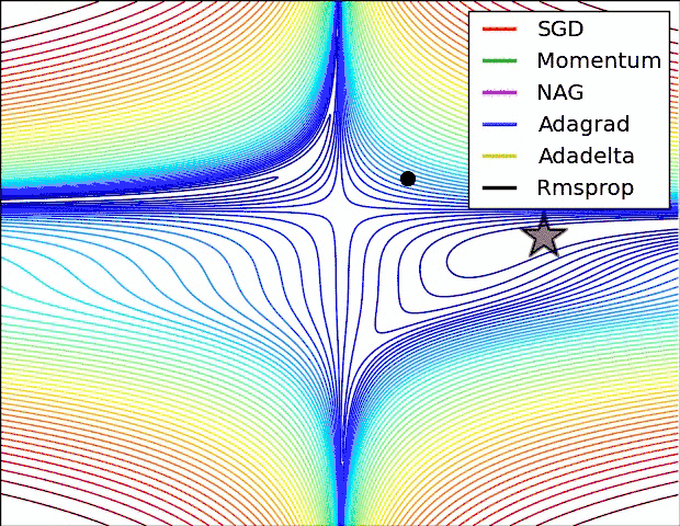从上图可以看出,在鞍点(saddle points)处(即某些维度上梯度为零,某些维度上梯度不为零),SGD、Momentum与NAG一直在鞍点梯度为零的方向上振荡,很难打破鞍点位置的对称性;Adagrad、RMSprop与Adadelta能够很快地向梯度不为零的方向上转移。
