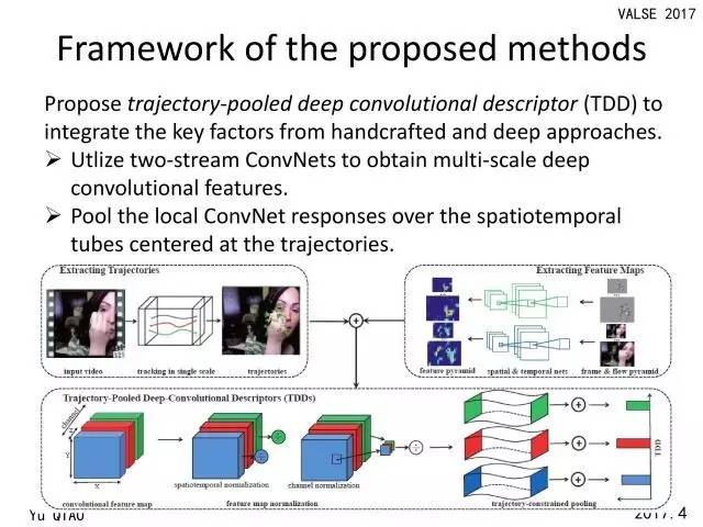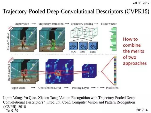 后面,我们把在传统方法中积累的一些经验和深度学习的方法做一个结合。在传统方法中我们会使用一些运动轨迹——通过光流跟踪的运动轨迹,使用运动轨迹的好处是,可以比较好的在运动比较显著的区域进行特征的集中提取,然后对传统方法沿着运动轨迹提取的一些卷积特征做下采样操作。这个是CVPR2015的工作。