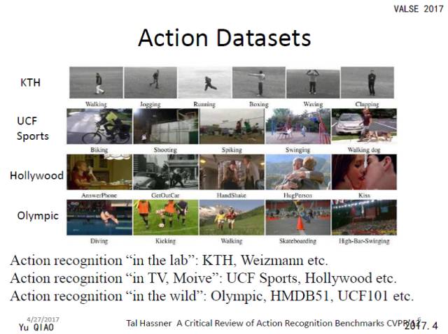 其实,我们可以把他们分为三种类型:一种类型的数据库是早期实验室采集的,背景相对简单和固定,只有一个人在视频中央进行某个特定行为。后来,人们逐渐开始从体育转播的视频或者从一些电影中录取一些行为视频,因为这些视频中的人是一些专业的演员或者体育运动员,而且是使用专业拍摄设备拍摄,质量比较高;最后人们关心的行为是activity in the wild,也就是指一些用户拍摄的各种各样的视频数据。