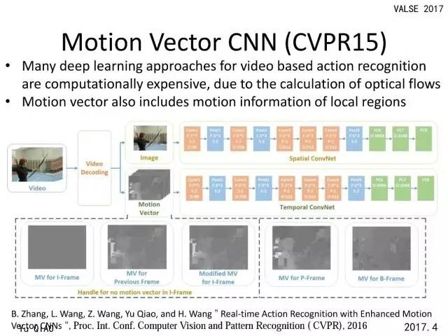 处理视频的时候数据量比较大,但很多视频应用对实时性有要求。未来加速,我们就提出了一个用运动向量代替光流的方法,运动向量只存在于压缩视频MPEG或者h.264中,无需计算就可获得;当然直接用运动向量会造成识别率很大的降低。