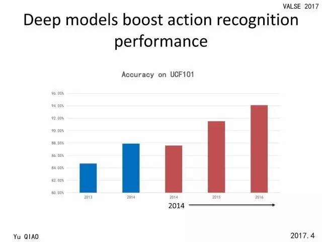 如果用一句话概括过去几年视频行为识别的进展,可能跟很多领域一样:深度模型大大推动了行为识别率的提高。事实上,在视频领域取得成功比在图像上要慢一些,甚至在开始的一段时间,深度学习的方法并不是特别成功。这里列出了一个从2013年到2016年大家用的非常广泛的UCF101数据库上的一些结果。在2014年,当图像领域深度学习方法已经远远甩出非深度学习方法的时候,在行为识别领域,都是非深度学习做的方法要更好一些。当然,从2015年深度学习方法开始取得了一些进展,然后到2016年、2017年,现在深度学习方法已经非常有效了。所以,下面主要围绕深度学习的方法,来回顾一下视频行为识别领域的发展历史。