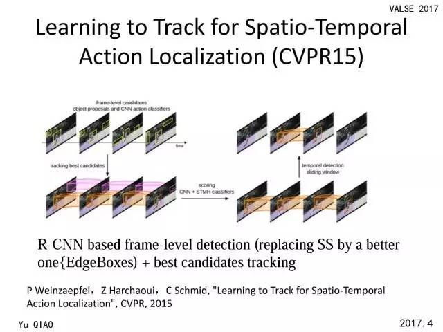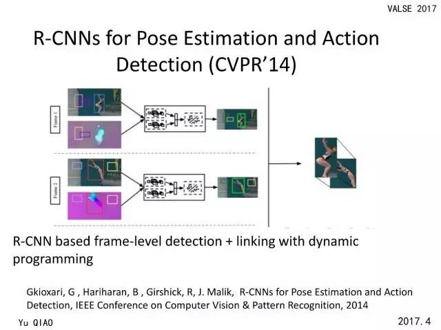 除了视频的识别之外,视频中的行为检测也是一个非常重要的问题,这个问题很大程度上是跟随物体检测方法的进步。较早的时候,就是伯克利的一个组把RCNN也运用到视频检测中,通过动态规划的方法把RCNN检测的框连接起来。