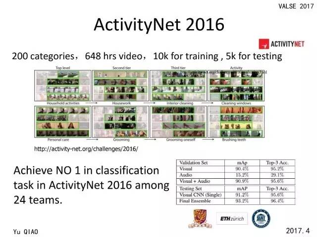 在过去的一年中,可以看到有两个比较大的数据库,一个叫做ActivityNet。这是一个行为的数据库,有200个类别,600多个小时的视频。在CVPR2016上,该数据库建设方围绕该库组织了一个竞赛。我们和香港中文大学、苏黎世联邦理工学院(ETH Zurich)一起获得了这个比赛的第一名。通过融合音频的方法,在这个数据库上可以得到93%的识别率。