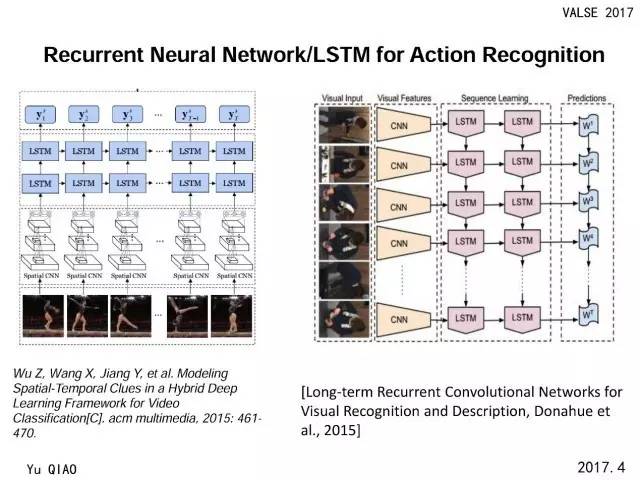 在解决这个短时的视频行为识别问题后,人们越来越关注长时的序列,自然就考虑把递归神经网络(RNN、LSTM)这些模型用于时序建模。常见的方式是,使用卷积神经网络(CNN)提取图像帧的特征,把CNN抽取的特征送到长短期记忆网络(LSTM)中去,然后做分类,这个框架也是后来很多做video caption工作的一个基础。
