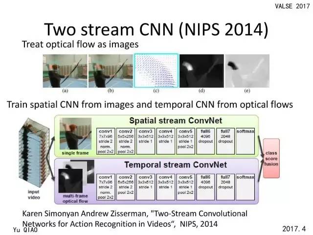 效果更好的是基于VGG的一个工作,Two stream CNN。以前做视频识别的时候,对于运动或行为信息,都会使用光流的信息,这个网络把光流当成一个图像,光流本身是一个向量,可以把x方向y方向当成两张图像,然后再对光流图像训练一个卷积神经网络。这个方法与比传统非深度学习方法相比只有不到一个百分点的差距。