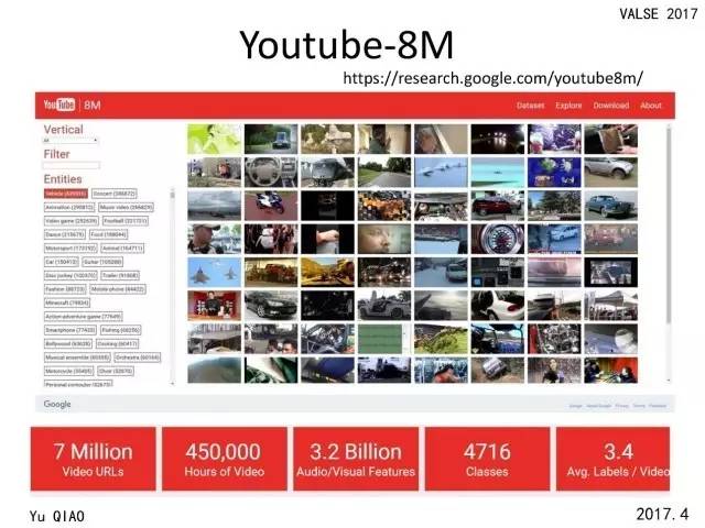 另一个更大规模的数据库叫YouTube-8M。这个数据库由谷歌建立,其中的数据都来自YouTube,总共有700多万,包括45万个小时的视频,4700多个类别。谷歌今年用这个数据库在Kaggle上也组织了一个竞赛。