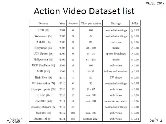 这里列出了从2004年到2014年开发的比较主要的数据库。可以看出,这些数据库随着时间发展,其种类从传统的几个类别到几十个类别,再到几百个类别,一直在扩充。当然这实际上也只是行为的一个子类。就是说行为的类别成千上万,非常多,字典中很多动词或者动名词都可以对应于一个行为。另外,也可以看到数据库中视频的数据量也变得越来越大。