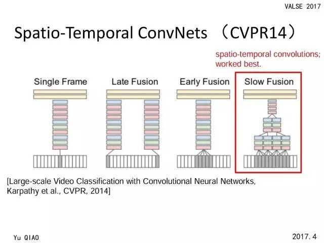 在2014年,受卷积神经网络在图像分类领域取得的成功的启发,大家开始考虑把卷积神经网络用于视频分类,但是,早期通过微调在ImageNet数据集上训练的网络获得的结果都不太好,大概有5到6个点的识别率的提高。当时大家的一个共识就是数据量不够,这时谷歌就建立了一个100万的数据库,叫做Sports-1M。在这个数据库上,他们通过融合卷积神经网络特征的方法构造了几种融合(fusion)策略,但是这个方法的结果并不是很好,比如说,当时这个方法在UCF101的识别率只有百分之六十几。