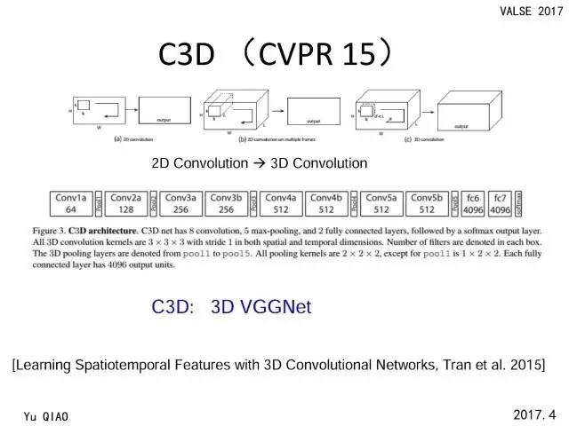 此后研究人员希望提升深度学习方法在视频分类的应用,一个比较成功的工作是Facebook的C3D。简单来说,这个工作就是把二维卷积推广到三维。把VGG的网络中3*3的卷积核变成了3*3*3。虽然说起来简单,真正想把这个网络训练起来是需要相当的功力的。