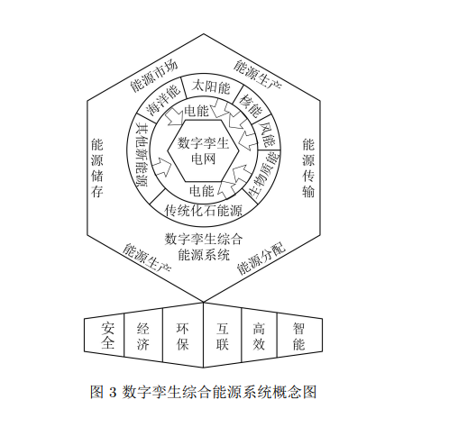 传统电网往往由于设备复杂、管理水平低下等导致其运行效率低、能耗高[59],随着以新能源为主体的新型电力系统不断发展,传统电网要抓住新能源技术和数字化技术,加速向综合能源系统演进。未来的综合能源系统将以电能和电网为核心,因此,数字孪生综合能源系统将以数字孪生电网为核心,具备环保、安全、互联、智能、高效、经济等特征,从能源生产到消费贯穿能源行业的方方面面[58],其概念如图3所示。