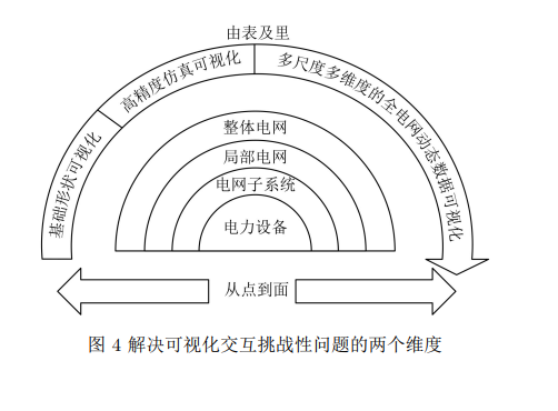 物理电网跨域广、设备多、运行情况多样,这些特点就造成了电网中存在数据量庞大、数据交互频繁、数据更新快等问题。在完成孪生电网的建模后,这些问题就会给孪生电网的可视化交互分析带来挑战。应该如何设计可视化分析与交互的方案,从而使得孪生电网能更好地赋能电网企业的决策、执行、运营等环节;应该如何保证可视化技术能够良好响应,从而体现孪生电网的实时性、准确性,体现数字孪生电网可视化相比较于传统电网仿真技术的优势。工业4.0研究院就数字孪生电网的发展问题给出1.0-3.0的演进过程[61],即从“DTL1(Digital Twin Level 1)的几何形状”到“DTL2引入GIS(Geographic Information System)等数据”再到“DTL3全面采用点云驱动”。基于此演进过程,在可视化方面,数字孪生电网可以从两个维度解决这些问题,如图4所示:首先,如何从点到面,从单一的电力设备到电网中的简单子系统,从子系统再到局部电网,从局部电网到整体电网;其次,如何由表及里,从基础形状可视化到高精度仿真可视化,再到多尺度多维度的全电网动态数据可视化。