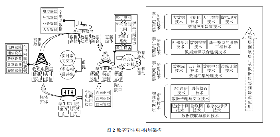 (2)论述了数字孪生电网架构及实现。在架构方面,基于已有研究中提出的架构和数字孪生一般化架构,提出了包括物理电网层、孪生数据层、孪生电网层、孪生应用层的4层架构体系,并就4层架构的孪生电网实现技术进行了总结,从技术实现角度总结了数字孪生电网的解决方案。