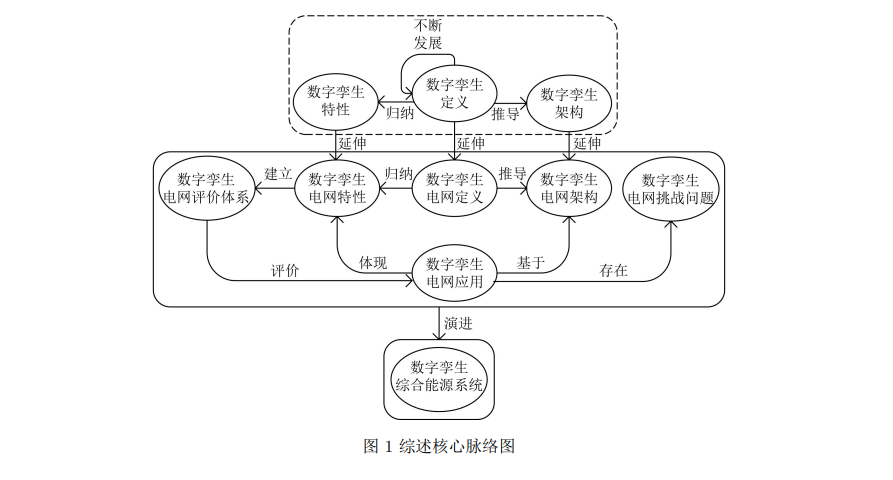 数字孪生电网(Digital Twin Power Grid, DTPG)的定义目前仍未得到有效的统一。但现有研究工作主要是借鉴数字孪生技术在其他领域的应用,将数字孪生技术应用于电网领域,构建出数字空间中的电网孪生体。传统电网仿真技术利用离线数据进行模型训练、更新,且仅对单一问题进行分析决策,不同于此,DTPG的意义在于对物理电网进行全面、准确、实时的数据感知,保障模型训练和更新的实时性、高保真性,实现多尺度的电网动态数字化。在电网数据感知和传输、数据监测和分析、决策制定和执行等方面利用DTPG可以增加或拓展物理电网的功能。因此数字孪生电网不仅是物理电网的复制。本文从数字孪生电网的特性与评价标准,典型架构设计,场景应用与演进这3个方面进行了文献综述,综述核心脉络如图1所示。