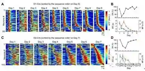 图2.直接通路和间接通路群体神经元的顺序性电活动伴随着学习逐渐产生:(A)直接通路和(C)间接通路的同一群神经元在小鼠学习过程中的电活动模式图(所有天均按照最后1天的神经元平均ΔF/F峰值时间排序,按照黑线标出的推杆运动的起始时刻来对齐)。(B,D) 与(A) 图和(B)图数据分别对应的小鼠在任务学习中的行为学表现。