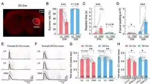 图3.选择性抑制不同通路的神经元引起行为学参数的不同变化:(A-D) 选择性抑制直接通路活动引起推杆次数的下降和反应时间的延长,选择性抑制间接通路活动只显著增加了试验间隔内的推杆次数。(E-H)抑制任一通路的活动均引起小鼠推杆轨迹稳定性的下降。