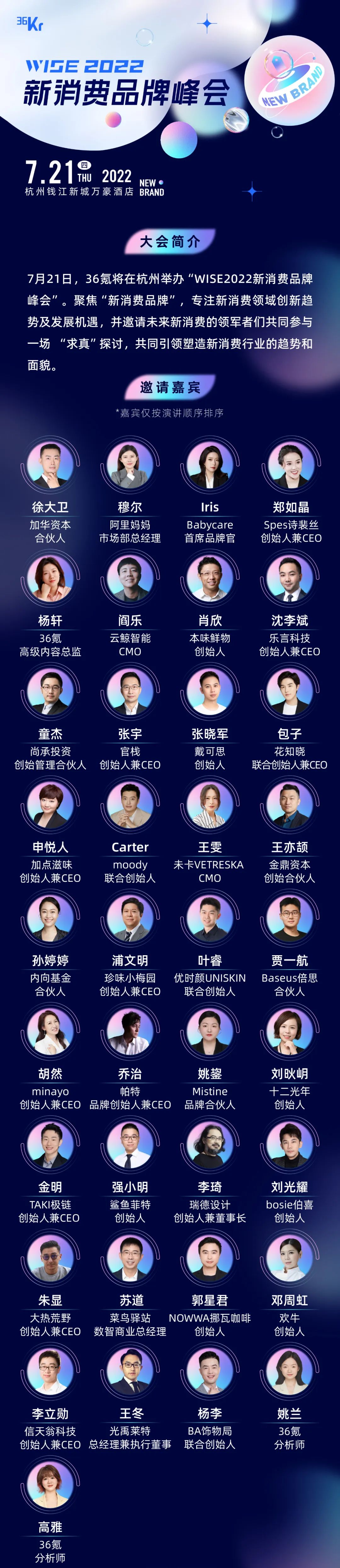 7月21日(周四)9:00,36氪“WISE2022x新消费品牌峰会”将在杭州钱江新城万豪酒店举办,我们邀请到了30+知名投资机构、消费品牌方和服务商的高管们一起来探讨新消费品牌的创新趋势与发展机遇。