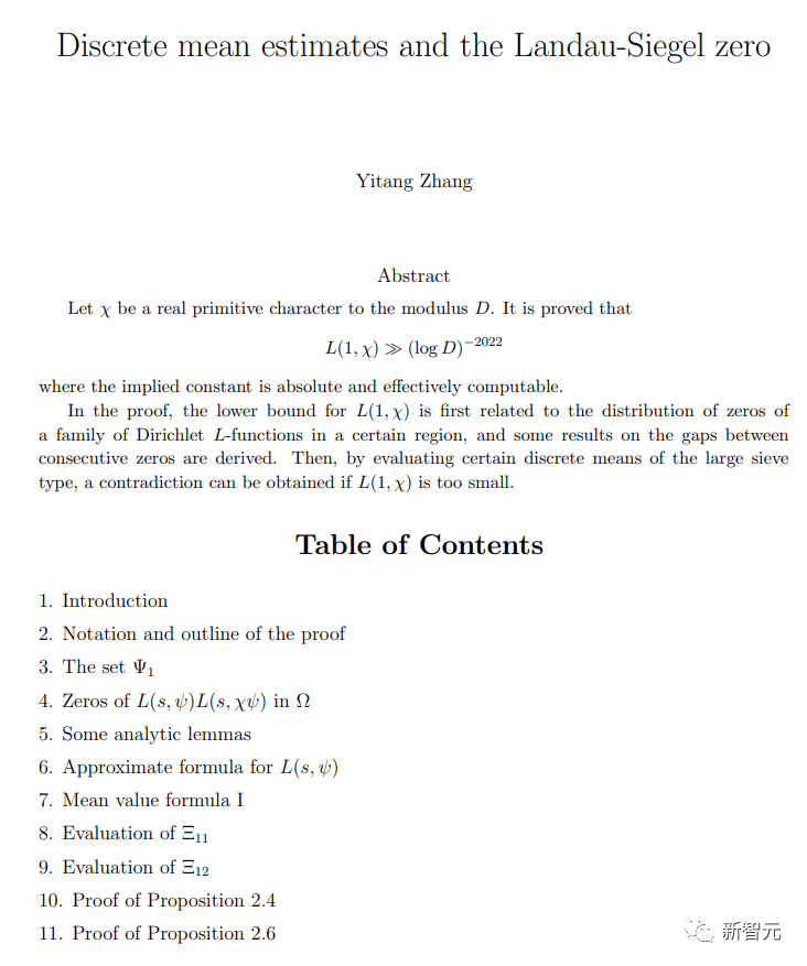 目前,解决这个零点猜想问题的111页的完整版预印本论文「Discrete mean estimates and the Landau-Siegel zero」已经可以下载。