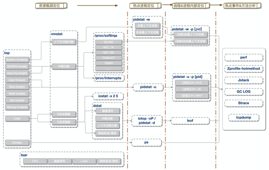 利用现有常用的工具,我们常用的排查策略基本如下图所示: